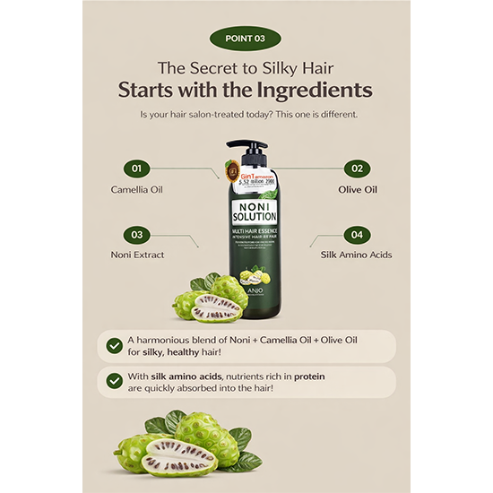 ANJO Professional Noni Solution Multi Hair Essence is a nourishing hair treatment designed to help restore shine, smoothness, and moisture to dry or damaged hair.