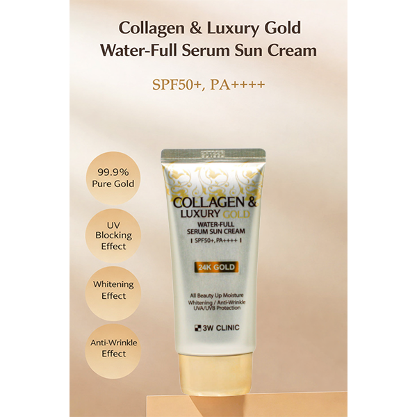 3W CLINIC Collagen & Luxury Gold Water-Full Serum Sun Cream is a multifunctional sunscreen that combines skincare and UV protection in a lightweight, moisturizing oil-in-water formula.