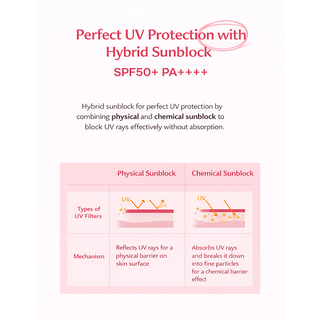 A hybrid tone-up sunscreen combining physical and chemical UV filters to provide strong broad-spectrum protection while maintaining a lightweight, comfortable finish. The pink tone-up formula helps naturally brighten dull skin and create a radiant, even complexion.