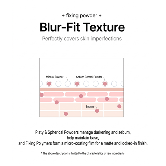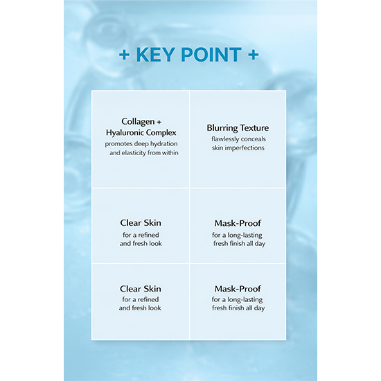 Formulated with a collagen + hyaluronic acid complex, it provides moisture care while keeping the skin firm and hydrated. The fixing powder system absorbs excess sebum and prevents darkening, helping maintain fresh base makeup for long hours. The mask-proof formula ensures long-lasting adherence without transfer.