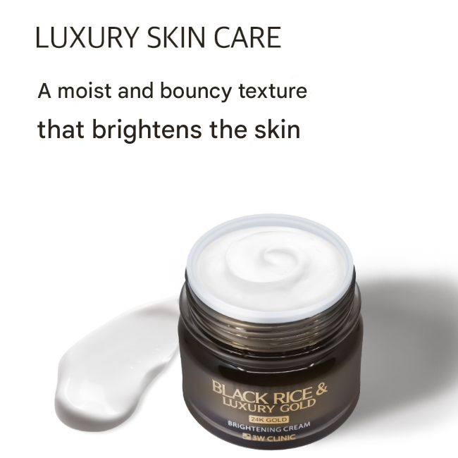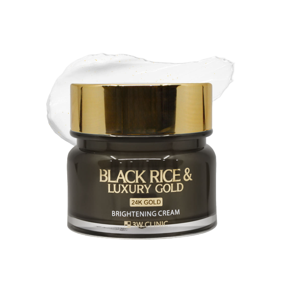 3W CLINIC Black Rice & Luxury Gold Brightening Cream is a high-nutrition brightening cream designed to deliver moisture, elasticity, and radiance through a 3-step luxury brightening system.
