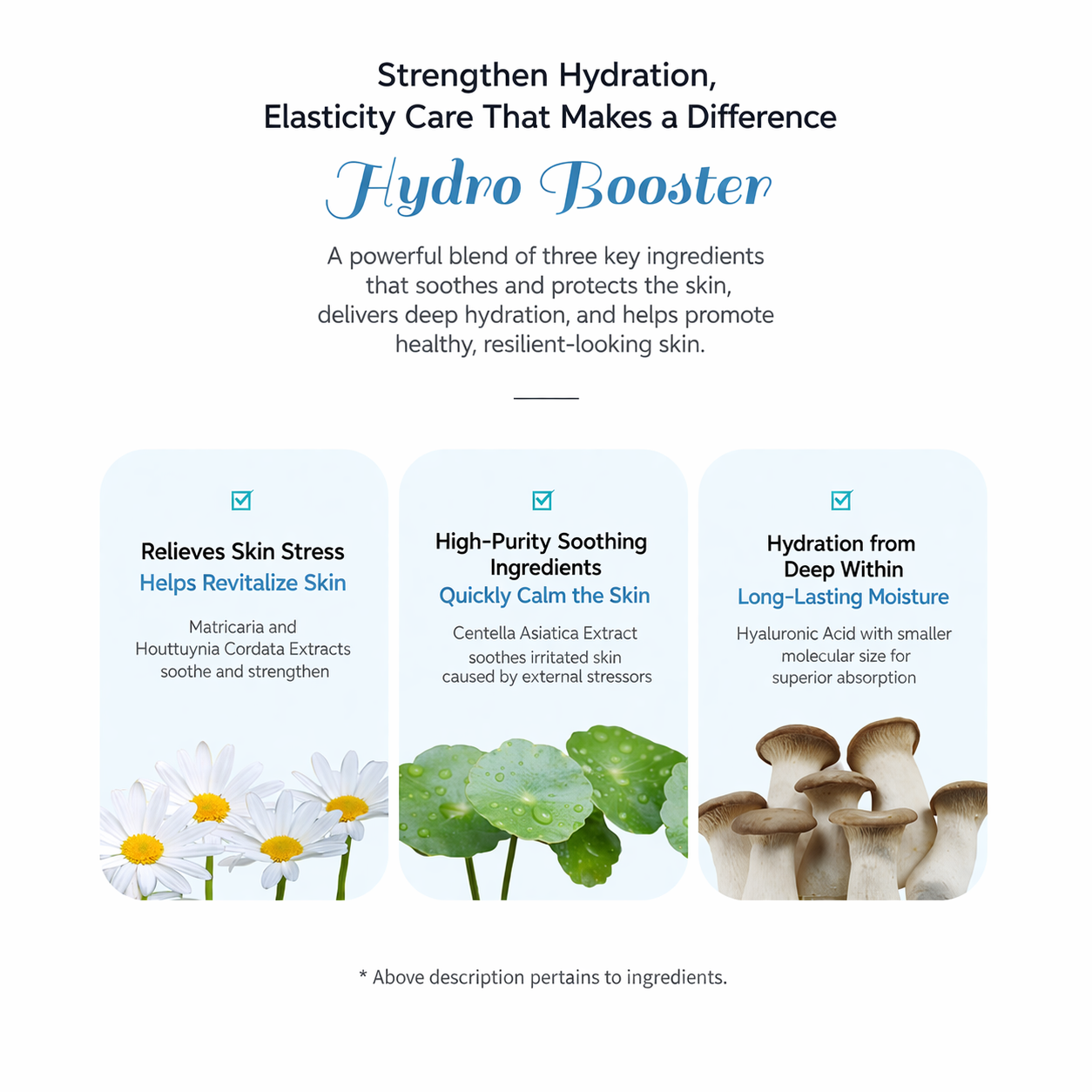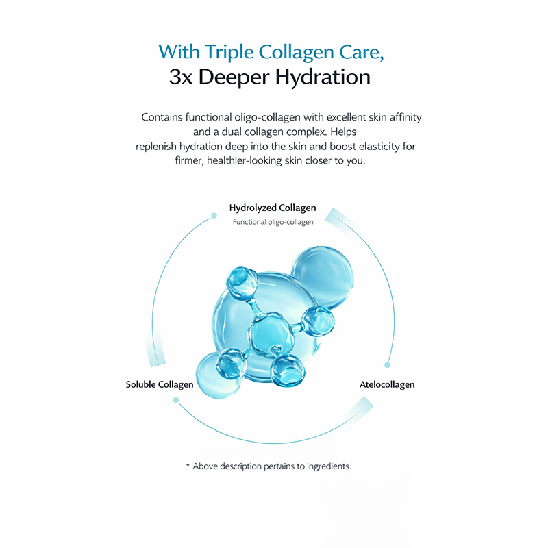 Formulated with Soluble Collagen, Hydrolyzed Collagen, and Atelocollagen, it provides intensive moisture and helps strengthen the skin barrier. The hydro booster system delivers long-lasting hydration, while soothing botanical ingredients help calm stressed skin and improve overall skin condition.