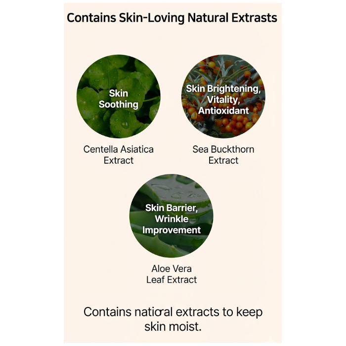 • Sea Buckthorn Extract (Vitamin Tree Extract) – Supports skin vitality and radiance